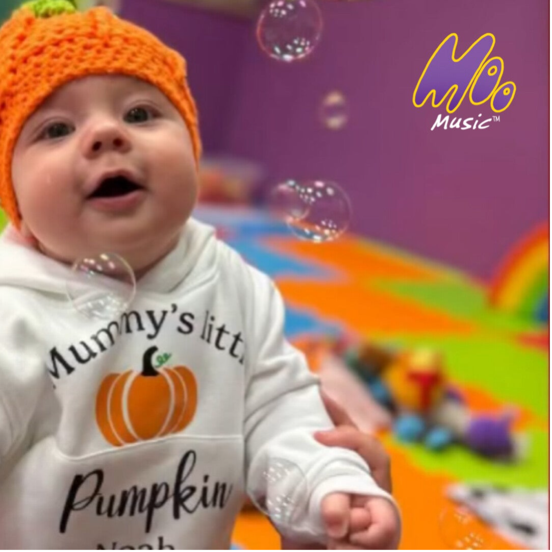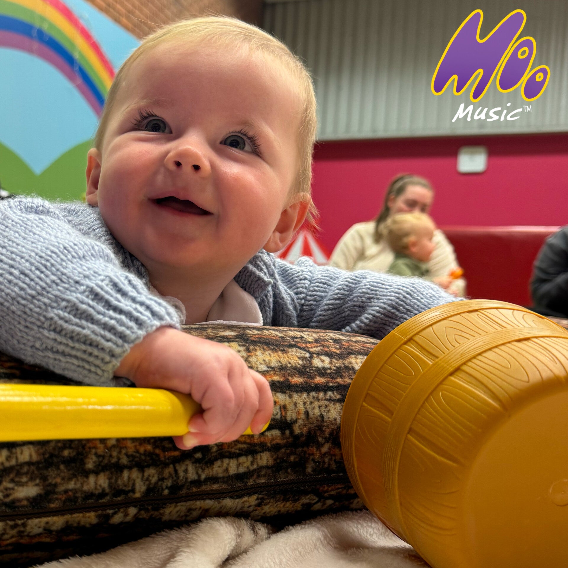 Each class begins with a warm welcome song, helping children feel settled and excited to start. From there, we move through a variety of activities using original Moo Music songs, colourful props and musical instruments.